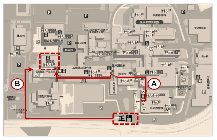 医学分館は医学部 (清武キャンパス)の東側に位置している二階建ての建物です。周りの高い建物に隠れて見えにくいので道順を二通り案内します (どちらも徒歩を想定しています)。